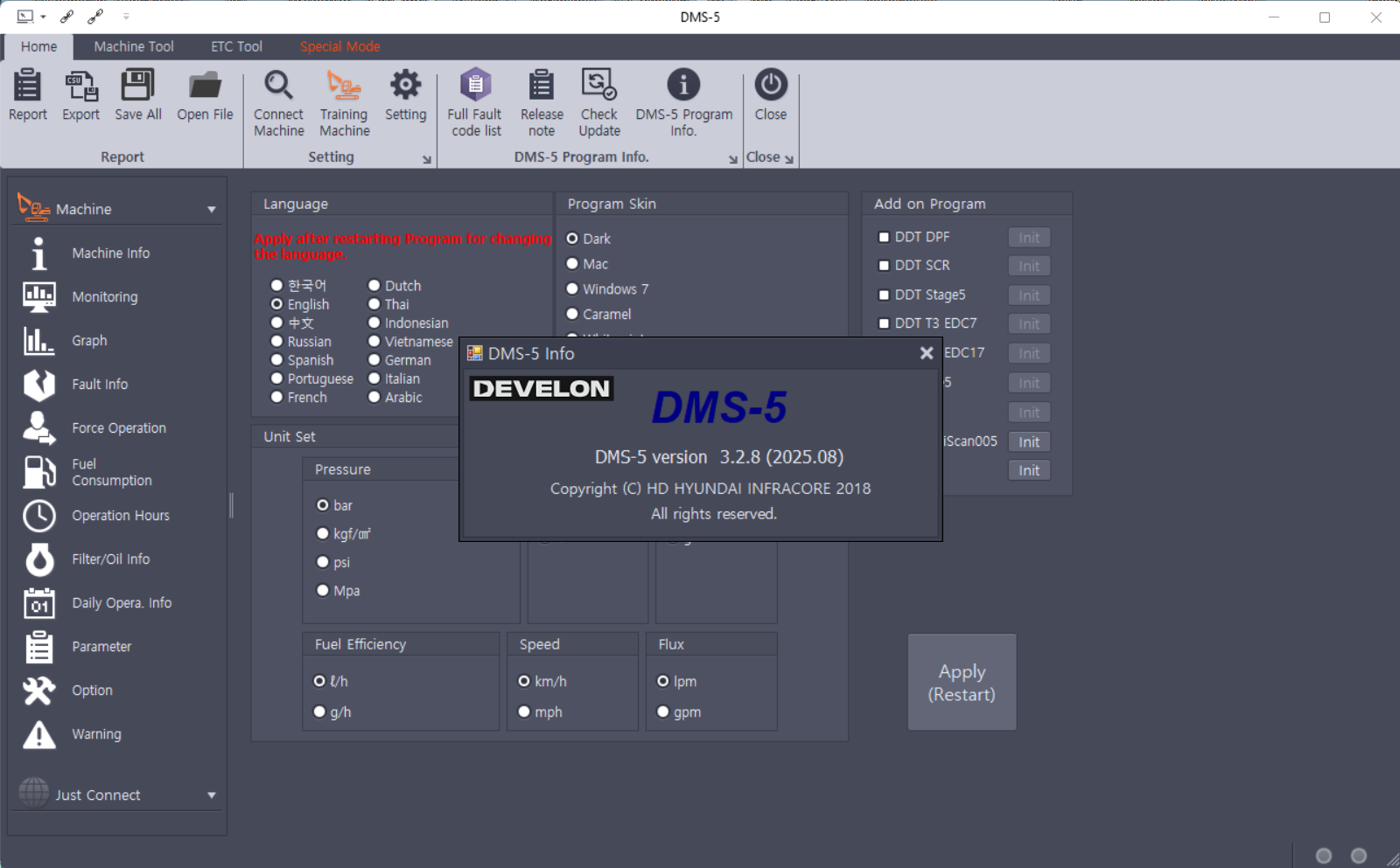 Doosan DMS-5 3.2.8 (Doosan Data Monitoring System) is a special diagnostic software for Doosan machine.You are able to do monitoring,check graph output force operate,diagnosis…for Doosan excavator,wheel loaders.