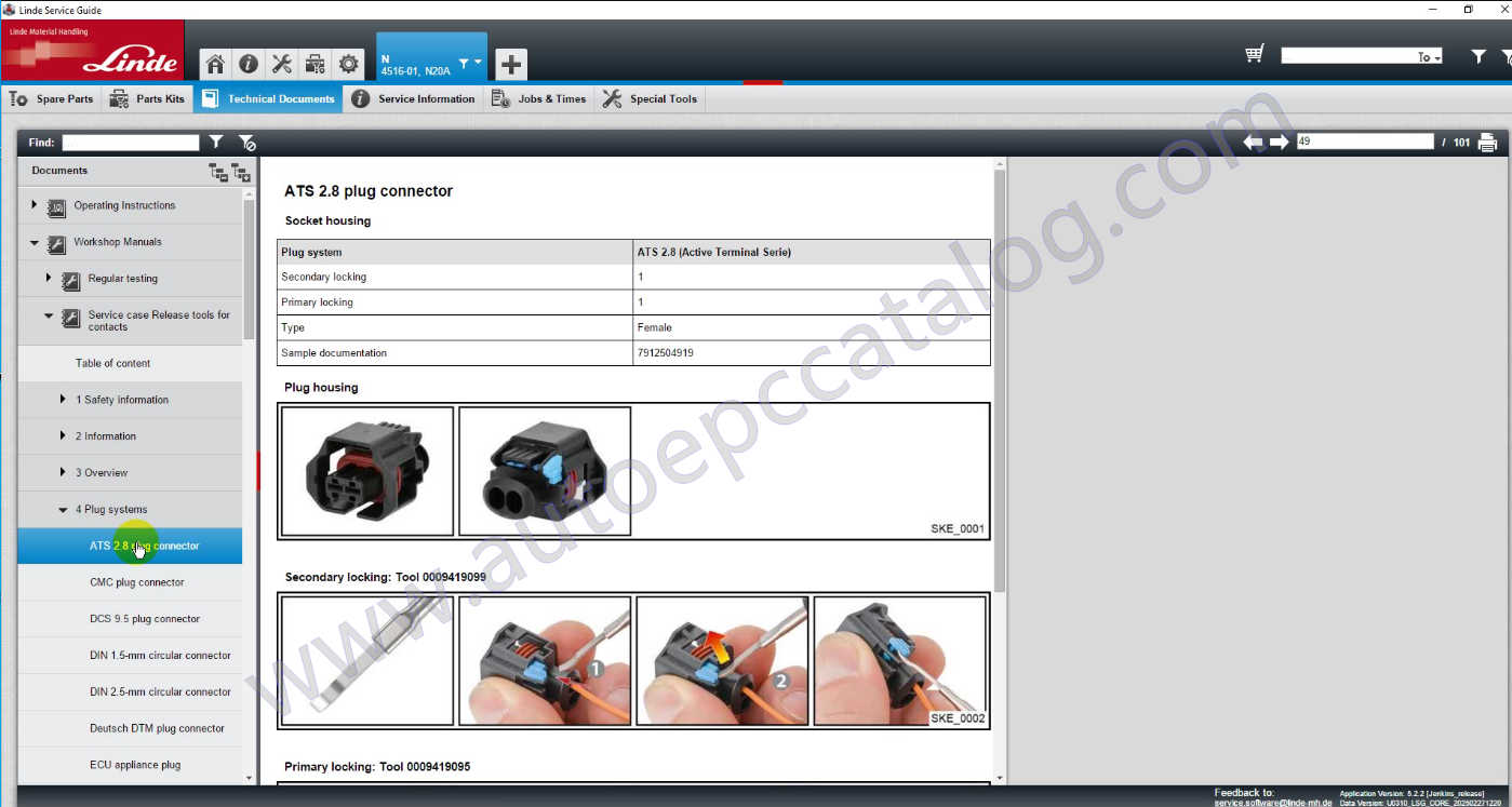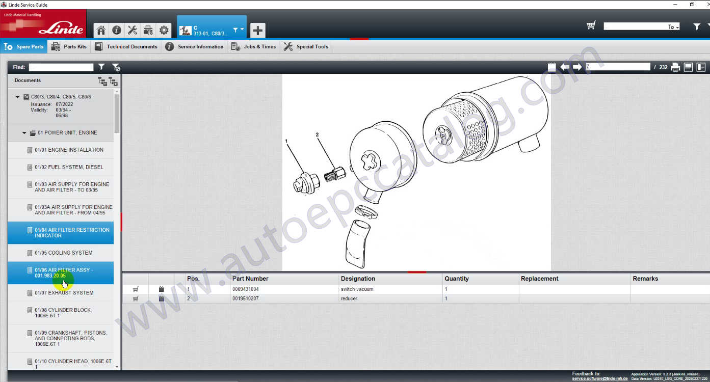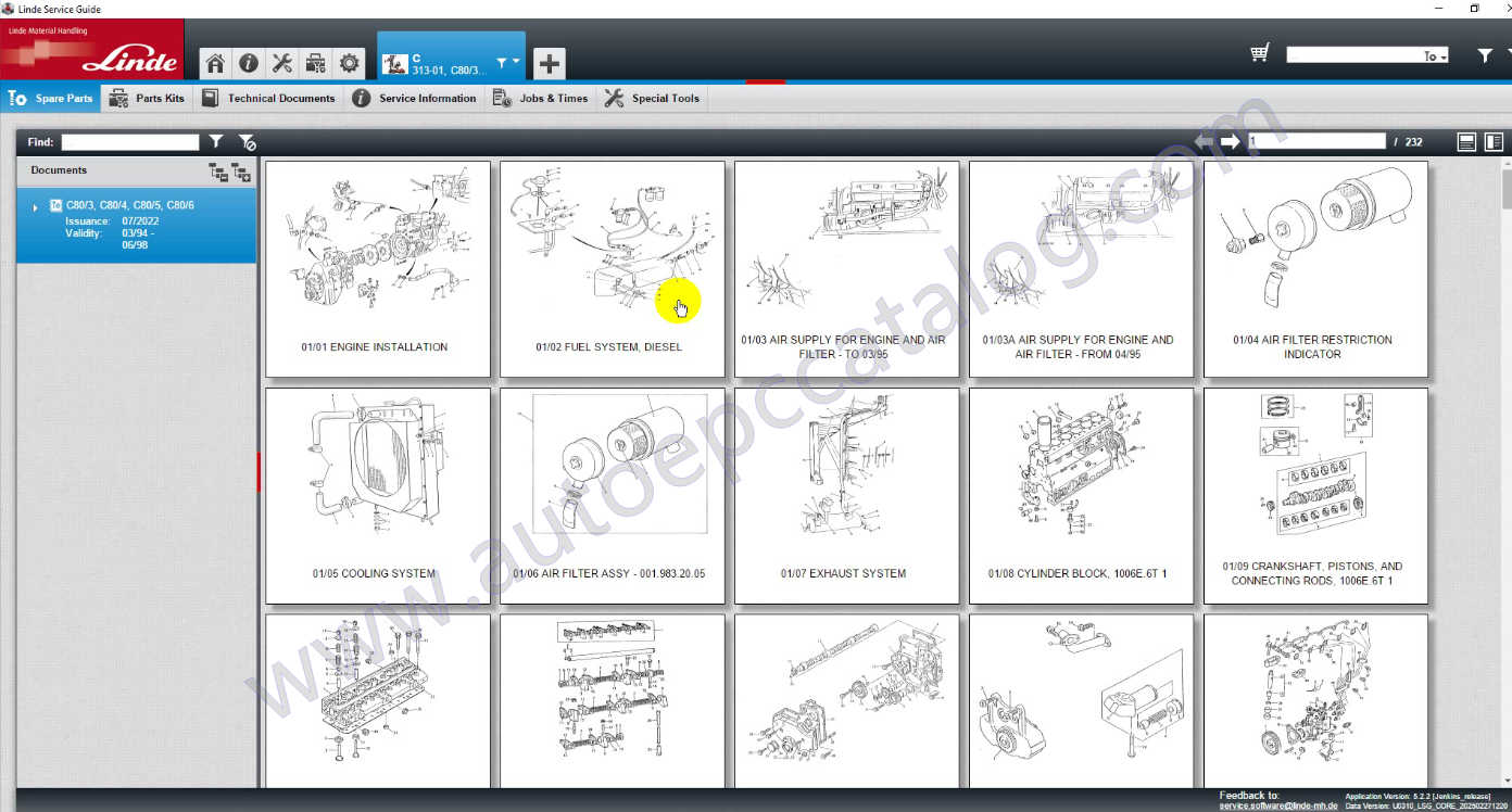 Linde Service Guide is parts catalog and service information system for Linde material handling equipment. This program contains parts identification data, service and repair manuals, wiring diagrams, hydraulic diagrams, special component instructions and service bulletins.